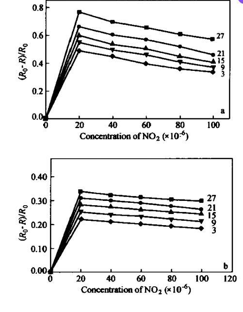 LB膜越薄,与气体的接触越充分,被氧化的程度也越高,因而对气体的响应也就越快。同层的PAN/NMP LB膜较PAN-AA/NMP LB膜具有更快的响应。3层聚苯胺LB膜对相对百分比为20×10??NO?的响应时间为10 s,但是当层数增加到27层时,响应时间就上升到90 s。而对于27层的聚苯胺与乙酸的混合LB膜,响应时间就更长,接近3 min。另一方面,响应时间还随NO?气体浓度的增加而增长。图5反映了15层聚苯胺LB膜的响应时间与气体浓度变化之间的关系。在相同气体浓度下,PAN/NMP LB膜较PAN-AA/NMP LB膜具有更快的响应和更好的灵敏度。PAN/NMP LB膜对相对百分比为20×10??NO?的响应时间为30 s,而PAN-AA/NMP LB膜则为50 s。当气体浓度增大到相对百分比为100×10??时,响应时间分别变化到150 s和180 s。