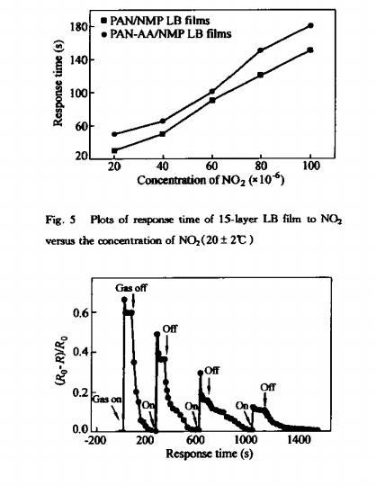 而对于聚苯胺与乙酸的混合LB膜,随着气体浓度的增加,电阻升高的原因可认为是在高浓度NO?的氧化作用下,发生了类似于脱掺杂行为而导致的结果。同时在图7(b)中还发现聚苯胺与乙酸的混合LB膜的NO?气敏性减小,这可能是由于聚苯胺被乙酸掺杂后,乙酸分子占据了聚苯胺中对NO?分子敏感的部位(如亚胺上的N原子),使得NO?氧化掺杂的可能性减小,从而导致敏感程度的降低以及响应-恢复可逆性的丧失。