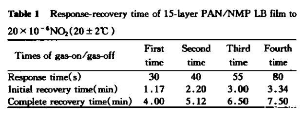 在敏感特性的测试过程中,我们发现纯聚苯胺LB膜对NO?具有较好的敏感性。聚苯胺LB膜的敏感性及响应时间与LB膜的层数有密切关系。随层数的增加,对NO?的响应时间逐渐增长,这可以从图4中看出。