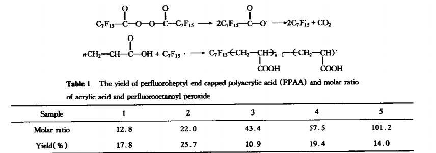 聚合反应是在溶剂CF_{2}CICF CI_{2}中进行的,大自由基将进行链转移,单基或双基终止反应,从而得出产物。反应步骤为在-17℃温度下将50mL含有预定摩尔的全氟庚双酰过氧化物的CF?CICFCI?溶液加入有氮气?;ぷ爸玫姆从ζ髦?,搅拌下加入已精制过的丙烯酸(密度1.0511g/mL),加热并恒温在45℃下反应10h,产物通过甲醇-乙酸乙酯溶剂体系重结晶并置真空烘箱中干燥,称重并计算产率(如表1)。