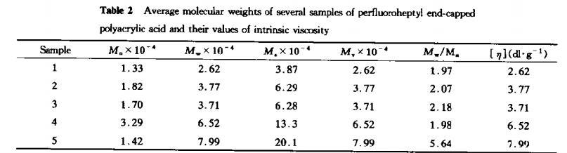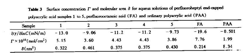 由表3可见,聚丙烯酸(分子量2.5x10?)在水溶液中界面活性极低(数据引自文献),每个PAA分子对空气-水界面的覆盖十分松散,全氟庚酸分子所占约0.21nm2,接近全氟烷烃紧密排列的分子轴截面积,而FPAA每个分子所占据的表面面积在0.32~0.46nm2之间,形成尾形链构象的刷状结构。全氟端基的引入,显著改变了PAA分子在界面的构象,由于全氟烃的憎水特性,在水溶液中趋于向水空气界面的吸附,从而极大的提高了界面活性,降低了界面能。