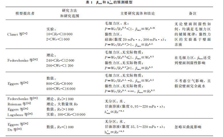 βmax和hmin*的多种预测模型如表1所示。从表1可以看出,在黏性力区,已有的理论、实验和模拟研究普遍认为βmax主要由Re控制,与Re0.2成正比,但目前实验数据和模拟验证均较少,已有实验主要针对硅油、甘油溶液,黏度在300 mPa·s以内,缺乏对于更高黏度液体的研究;另外,Eggers等的模拟研究不针对真实流体,且忽略空气影响和假设壁面完全疏水,与现实情况具有差异。在毛细力区,尽管Eggers等的模拟结果与Fedorchenko等的理论相符合,都认为βmax∝We0.5,但Clanet等的实验结果却表明βmax∝We0.25,实验所得We指数大小仅为理论的一半。因此,仍需对βmax进行更多的实验、模拟研究。