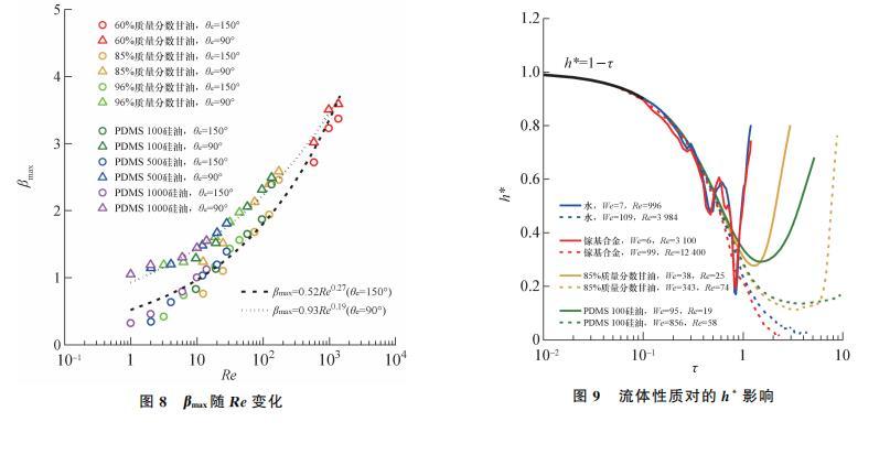 4)对于以往鲜有研究的高黏度PDMS1000硅油和超高表面张力的镓基合金,尽管这2种流体物性较为特殊,但其碰撞过程仍主要受Re和We影响。但当PDMS1000硅油以低速碰撞壁面时,Re接近于1,此时液滴的入射动能很快通过黏性力耗散殆尽,惯性力作用可忽略不计,液滴在壁面上近似于自发铺展,导致βmax和hmin*主要由液滴初始动能和壁面润湿性决定,偏离结论2和3中与We、Re之间的幂函数关系。
