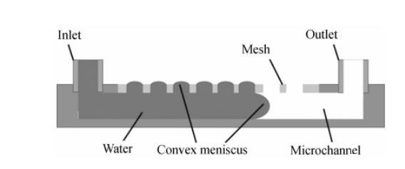 气溶胶到水溶胶的采样,一方面要求管道是开放的,以保证空气中的生物质能够进入液体;另一方面为了避免液体在流动过程中外泄,管道必须封闭。本文设计了一种开放的管道,其顶部开放面覆盖有疏水栅网,如图1所示。疏水栅网孔中的水在表面张力的作用下会形成一个弯月面,阻止水从栅网孔中流出。这样空气中的生物质就能通过栅网孔进入管道,同时管道中的液体可以稳定流动而不会外溢。