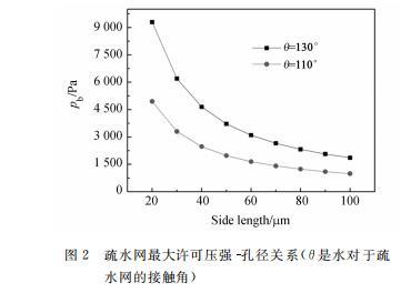 其中:sigma为液体表面张力,a为栅网方孔的边长,theta为液体对于栅网的接触角。计算中假设水温为20^{circ}C,此时水的表面张力系数sigma=0.0728~N/m(后面计算中都采用此参数)。最大许可压强Pb和孔边长的关系如图2所示,可以看到采用疏水性好、网孔小的栅网可以得到更大的Pb。