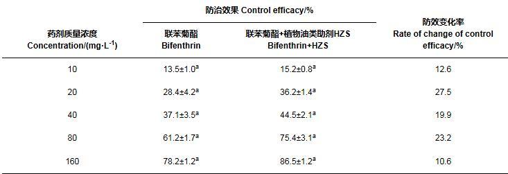 表6添加植物油类助剂HZS后100 g/L联苯菊酯乳油对石斛菲盾蚧田间防效的变化