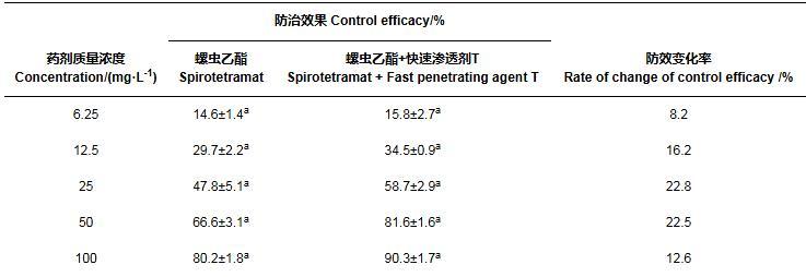表5添加快速渗透剂T后22.4%螺虫乙酯悬浮剂对石斛菲盾蚧田间防效的变化
