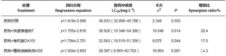 表4 3种助剂添加后联苯菊酯防治石斛菲盾蚧室内毒力变化