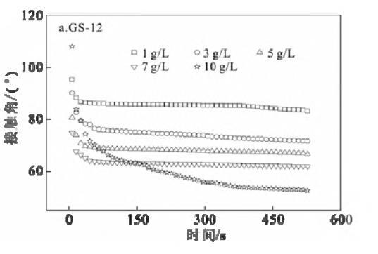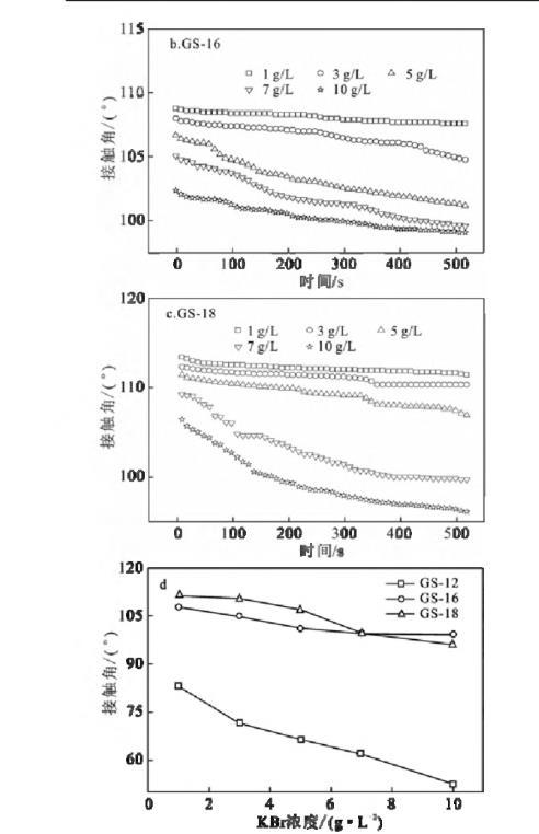 在KBr浓度区间1~10 g/L内,GS-12随着KBr浓度的增加,接触角显著减小,而GS-16和GS-18则变化不明显??梢越馐臀?对于GS-12而言,KBr浓度越高,固/液界面处的填料越紧密,导致气/液固界面张力值降低,而疏水链较长的GS-16和GS-18其自身降低界面张力的能力有限,所以,随KBr浓度增加,接触角变化有限[1,19]。此外,随着KBr浓度的增加,液滴在石蜡膜上的接触角值减小。