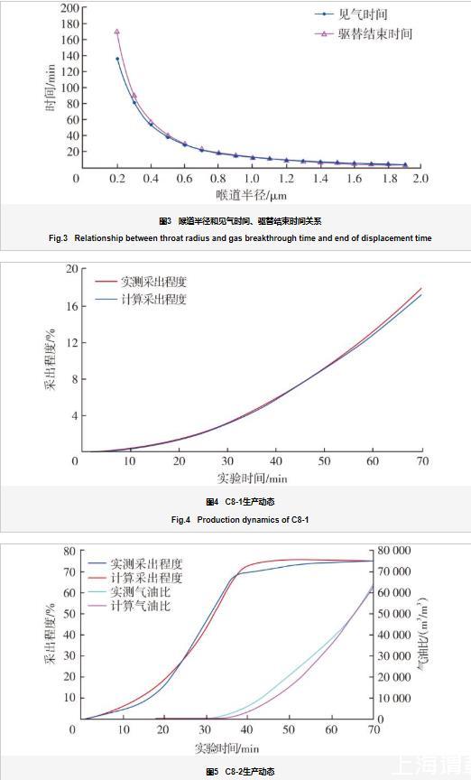 以时间为节点,运用节点分析法计算任一驱替时刻前缘位置以及见气时间和驱替结束时间(图3)。选择时间步长为2 s,从驱替开始起算,在2 s的时间里部分CO2开始进入喉道内部的同时导致驱替压差发生变化,进一步导致CO2-原油体系的界面张力以及原油黏度发生改变。因此,将驱替进行2 s后的实际驱替压差以及对应的界面张力、黏度等参数代入第2个时间步参与计算,依次迭代,直至CO2驱过程结束。运用该方法,结合喉道大小及分布频率特征计算得到C8-1和C8-2岩心并联CO2驱替全过程生产动态(图4、图5)。由图3可知:见气时间与驱替结束时间随喉道半径的增大而缩短,且喉道越大缩短幅度越小。喉道半径越大,驱替结束时间与见气时间的差值越小,可以推断物性较好的油藏见气后气油比上升较快。