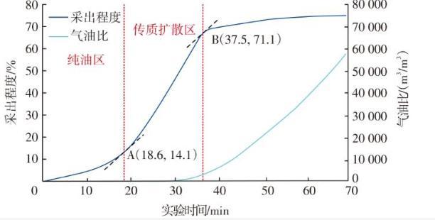 总结以上分析认为,CO2驱生产动态规律为:在CO2驱替前缘未达到井口前采出端为纯油流,此阶段CO2-原油体系作用时间短,溶解降黏、萃取等作用效果不明显,因此采油速度小、单井产量低且油井不见气,如图6中的纯油区,该区域主要依靠CO2驱动力采油,采出程度曲线呈缓慢上升驱势。随着开发推进,CO2-原油体系作用时间增加,溶解降黏、萃取等作用逐渐占据主要作用,原油黏度减小,此时油井开始缓慢见气。如图6中的传质扩散区,油井产量增加,采油速度加快,采出程度曲线快速上升。在纯油区向传质扩散区过渡阶段,采出程度曲线上存在一切点(图6中A点),其对应的时间18.6 min为见气时间,对应的采出程度14.1%为纯油区推进至井口时的采出程度。随着CO2驱的持续进行,传质扩散区大部分已经推进至采油井附近,油井产气量迅速增大的同时产油量迅速减小,采出程度缓慢增加直至稳定。在传质扩散区采出的末段,采出程度曲线上存在一切点(图6中B点),该点所对应的时间37.5 min近似为驱油结束时间,此时对应的采出程度71.1%为传质扩散区推进至井口时的采出程度。此后气油比迅速增大,CO2驱油进入末期。