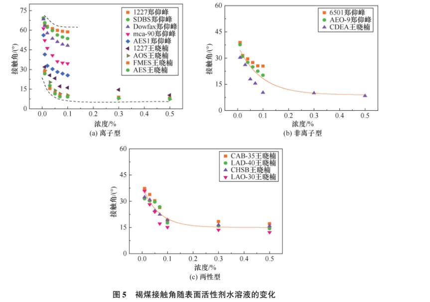 图5褐煤接触角随表面活性剂水溶液的变化