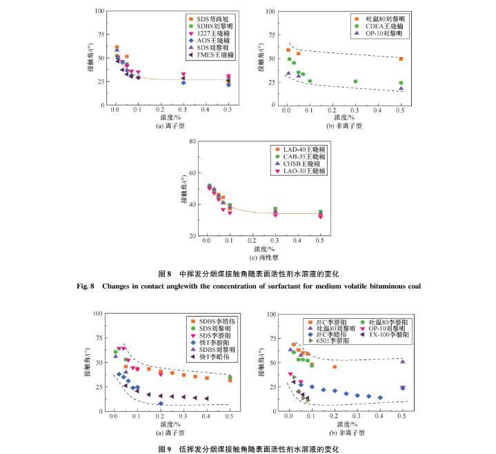 图8中挥发分烟煤接触角随表面活性剂水溶液的变化