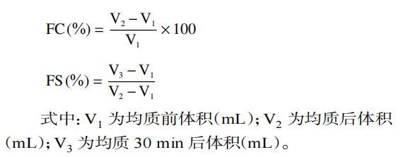式中:V1为均质前体积(mL);V2为均质后体积(mL);V3为均质30 min后体积(mL)。