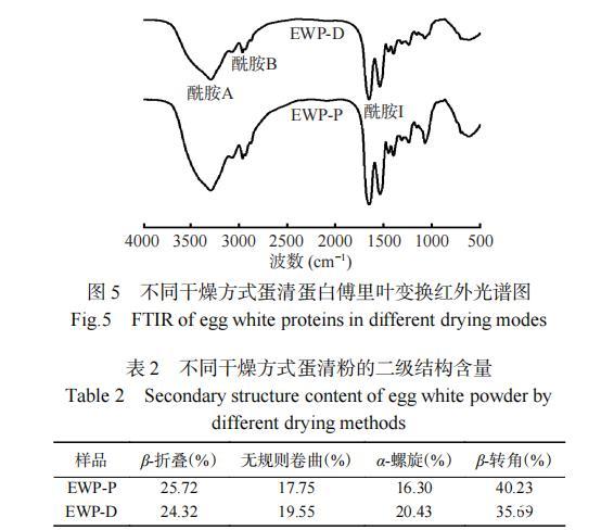 不同干燥方式蛋清蛋白的红外光谱如图5所示。EWP-P和EWP-D在酰胺A带(3700~3200 cm?1)处有强吸收峰,EWP-P的峰强大于EWP-D,表明干燥方式会影响蛋清蛋白的水合能力,这可能与蛋白质分子中N-H键舒展并与氢键形成了缔合体,或蛋白质分子与葡萄糖以共价键结合有关。酰胺B带(2961.64 cm?1)的弱吸收峰主要由C-N键产生。酰胺I带(1600~1700 cm?1)信号主要由C-O键伸缩振动引起,与蛋白质的二级结构有关,涉及β-折叠(1600~1640 cm?1)、无规则卷曲(1640~1650 cm?1)、α-螺旋(1650~1660 cm?1)和β-转角(1660~1700 cm?1)。采用Peak fit软件对不同干燥方式蛋清蛋白的酰胺I带峰强进行高斯曲线拟合分析,根据峰面积计算其二级结构的相对百分含量,结果如表2。EWP-P和EWP-D的二级结构以β-折叠和β-转角为主,EWP-P的β-折叠含量增加主要与卵转铁蛋白热变性有关,同时分子间的β-折叠结构也易转变为β-转角结构。而α-螺旋下降可能是因为热变性导致α-螺旋中的氢键断裂,进而发生了解螺旋现象。EWP-P无规则卷曲增加,表明其部分有序结构向无规则卷曲转化,蛋白变性明显,结构的随机性增强。